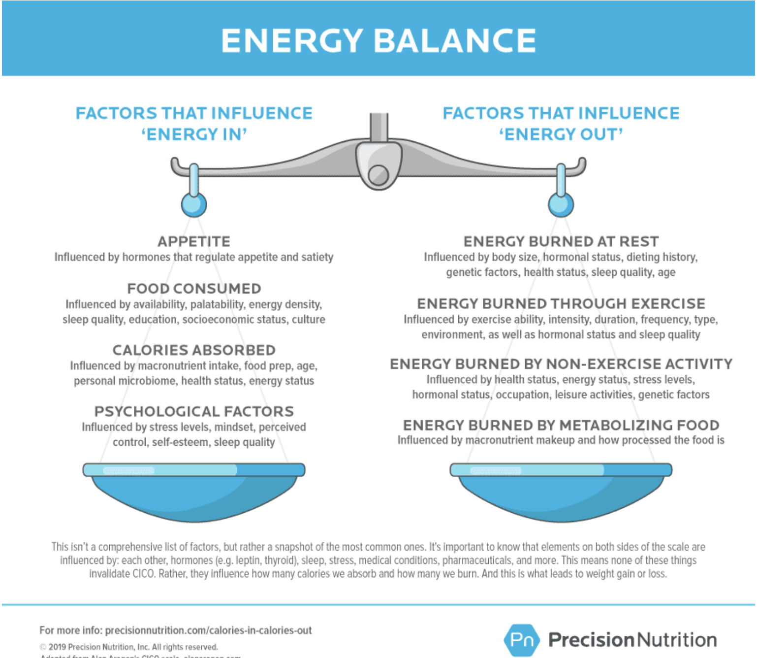 All calories DO matter. AND, there are lots of environmental, physical, and psychological factors that affect how much we eat and how much we move. I’ve always loved this infographic from Precision Nutrition showing all the hidden factors that go into the calories in, calories out equation.